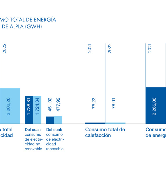 La electricidad constituye el 96 % de nuestro consumo energético y, por lo tanto, ejerce un impacto significativo tanto en nuestros costes globales de producción como en el medio ambiente. ALPLA obtiene la electricidad principalmente de la red local, que comprende una combinación de combustibles fósiles y fuentes de energía renovables. Además, siempre que es posible nos esforzamos por generar nuestra propia energía a través de sistemas fotovoltaicos instalados en nuestros tejados. Otra fuente de energía es el gas natural, que se utiliza predominantemente para fines de calefacción, aunque en raras ocasiones también depende del petróleo.