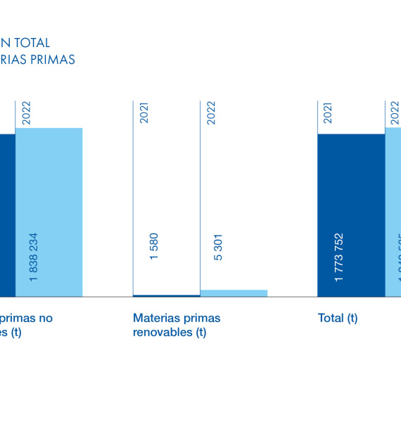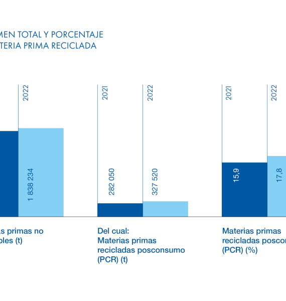 La proporción de materiales reciclados aumentó considerablemente durante el período del informe en consonancia con nuestros objetivos estratégicos. En 2021 compramos aproximadamente 282 000 toneladas de plásticos reciclados (de los cuales el 68 % era PET), lo que equivale al 16 % del total de materiales adquiridos. En 2022, esta cifra aumentó a 327 520 toneladas (un 68 % de PET), lo que equivale al 18 % del consumo total.